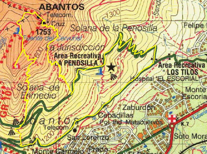 Por esta pista, asfaltada, comenzamos a caminar ganando altura de forma suave. En media hora habremos superado las zetas y la pista gira hacia el sur. A los diez minutos cruzaremos un paso canadiense a la altura del Área Recreativa La Penosilla. En otros cinco minutos cruzamos un nuevo paso canadiense introduciéndonos en el pinar. Al poco vemos una senda ascendente que parte de la derecha de la pista que pasaremos de largo. En diez minutos escasos, con una bonita vista sobre el Monasterio de El Escorial, veremos un camino que cruza la pista por la que venimos. En este punto abandonaremos la pista para seguir el camino hacia la derecha ganando altura. Llevamos a este punto una hora de ruta.